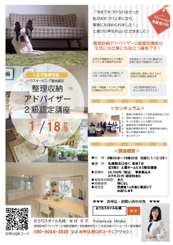 おうちスタイル札幌で受講できる、札幌開催の整理収納アドバイザー2級認定講座のご案内です。