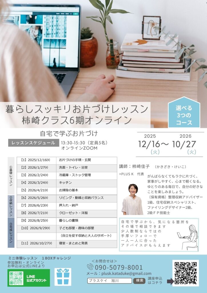 ご自宅で気になるところを一箇所、オンラインでプロのアドバイスを受けながら、またみんなで悩みをシェアしながらお片づけをする体験レッスンです!(詳細はこちら)