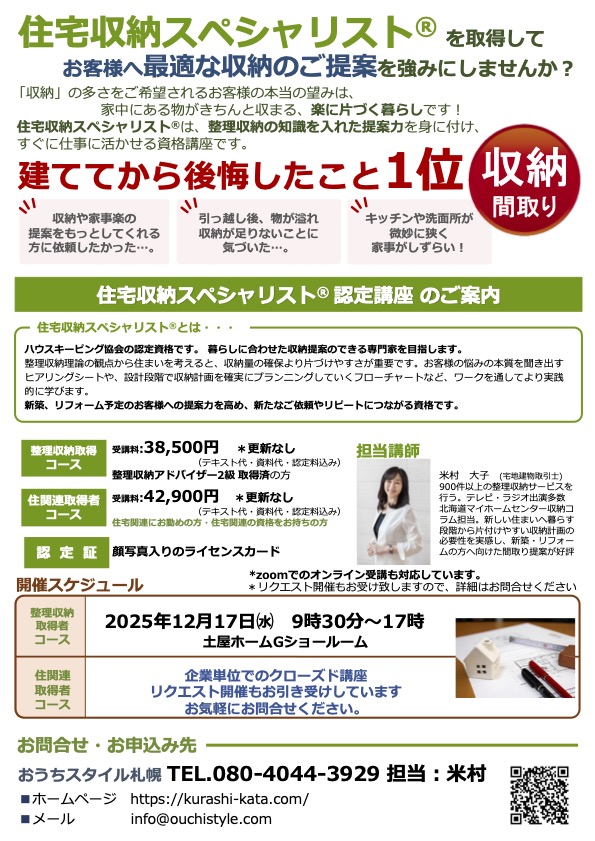 すでに住宅メーカー・不動産会社などに勤務、また住宅関連の資格を取得されている方には、整理収納アドバイザー2級の受講が免除されるコースもございます。通常の住宅収納スペシャリスト認定講座に、整理収納の基本に関するカリキュラムを1時間プラスとなっています。